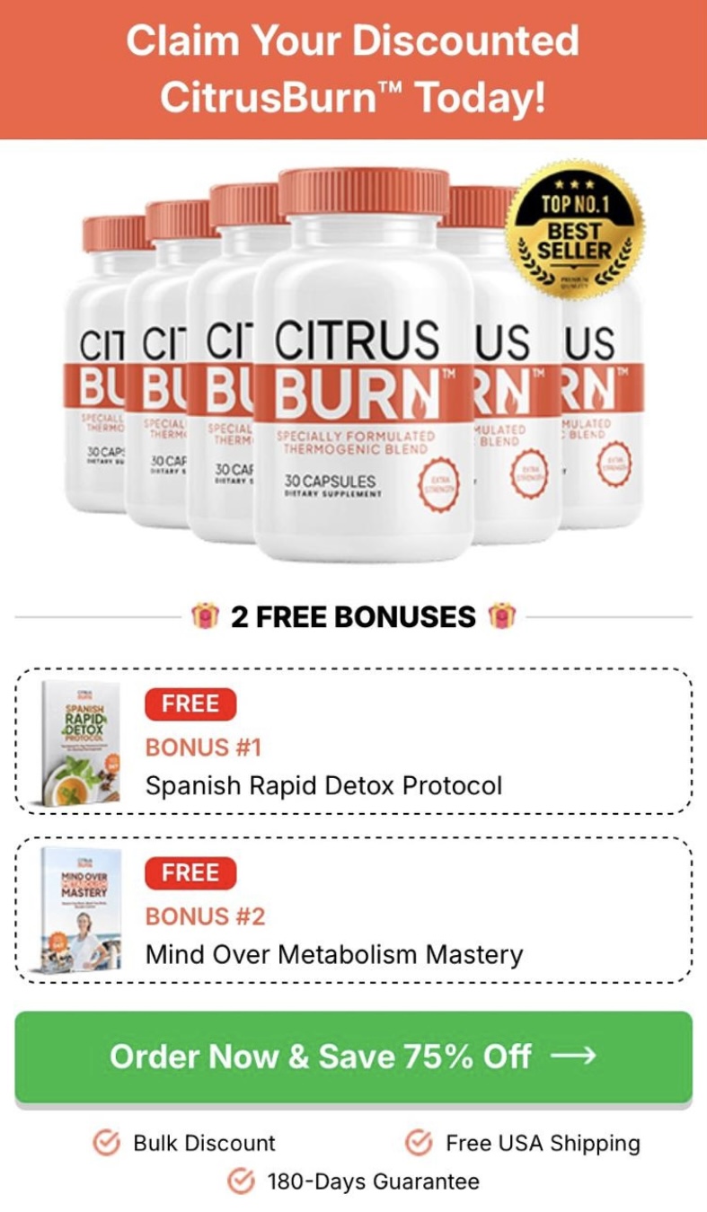 CÍTRUS BURN BUY NOW! Last chance to transform your body now: Citrus Burn boosts your metabolism and burns fat fast — stock is almost gone, buy today or miss this opportunity! Results may vary. Use with a healthy lifestyle. This product is not a substitute for medical advice.